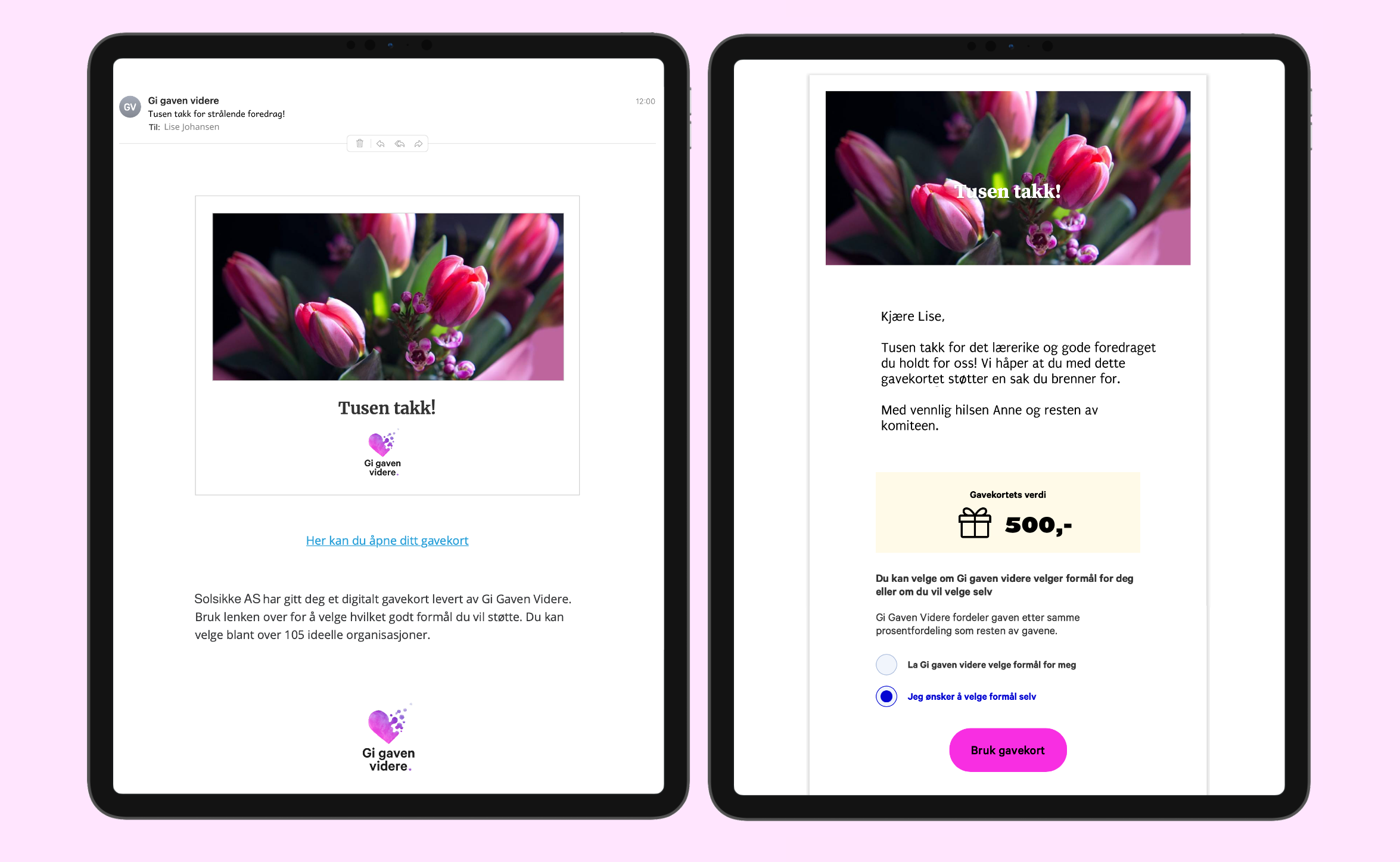 Gi Gaven Videre er digitale gavekort som støtter veldedige formål og ideelle organisasjoner! Når du bestiller gavekort velger du beløp. Den som får gavekortet bestemmer selv hvilket godt formål de ønsker å støtte, og kan velge mellom 120 flotte formål. Dette er et meningsfylt og bærekraftig gavealternativ til ansatte, samarbeidspartnere, foredragsholdere, jubilanter, konfirmanter og alle andre som vil gjøre noe godt for verden!